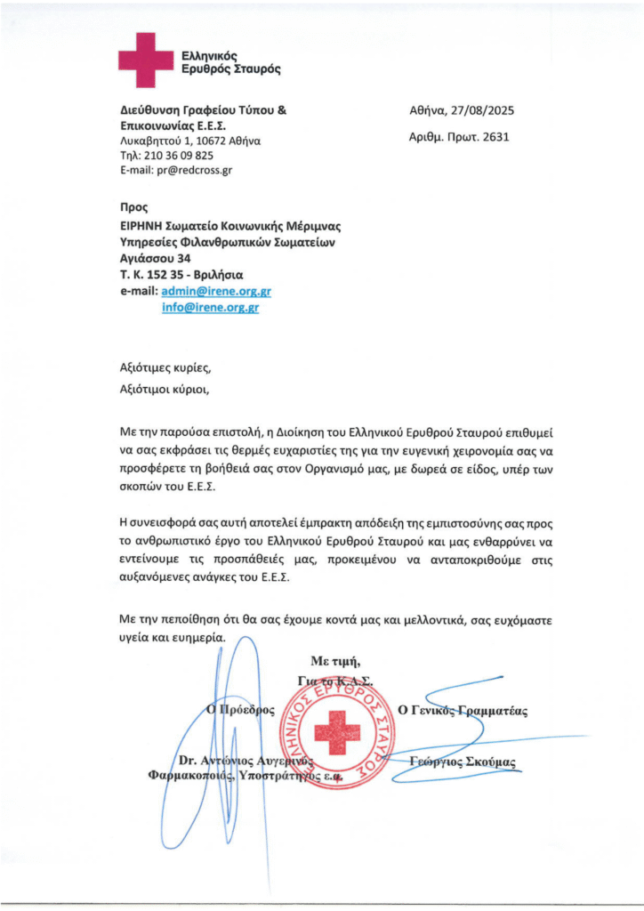 Το Σωματείο «ΕΙΡΗΝΗ» στέκεται αλληλέγγυο στους συνανθρώπους μας που επλήγησαν από τις καταστροφικές πυρκαγιές στην Αχαΐα. Με στόχο την άμεση ανακούφιση των πληγέντων, προσφέραμε τρόφιμα πρώτης ανάγκης και φαρμακευτικά είδη στον Ελληνικό Ερυθρό Σταυρό, στηρίζοντας όσους χρειάζονται βοήθεια τις δύσκολες αυτές ώρες.